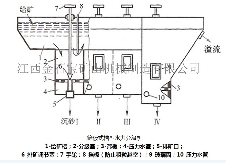 筛板式水力分级机的优点是构造简单,不需要动力。与机械搅拌式水力分级机比较,高度较小,便于配置。可以根据选厂处理能力的不同,制成四室、六室、八室等不同的规格。这种分级机在我国中小型钨矿选矿厂应用较多。
