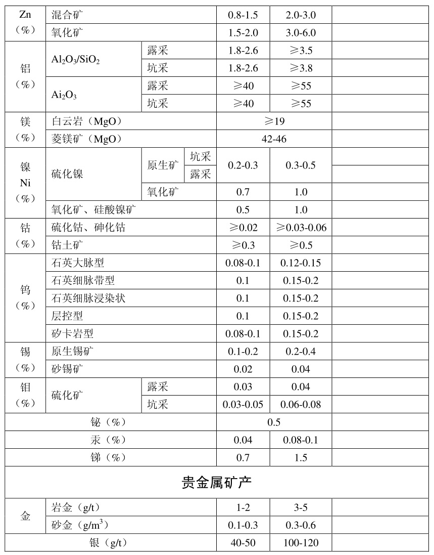 金属矿床矿产开发利用品位指标表